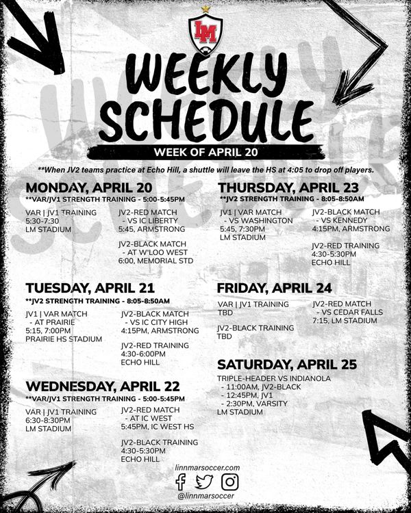 This week's weather looks much more conducive to full week of games, ending with a first of it's kind, triple-header on Saturday vs Indianola. Not only that but nearly all of this week's games are at Linn-Mar or at least in the Cedar Rapids area. So be sure to get out support the Lions at a stadium near you!!